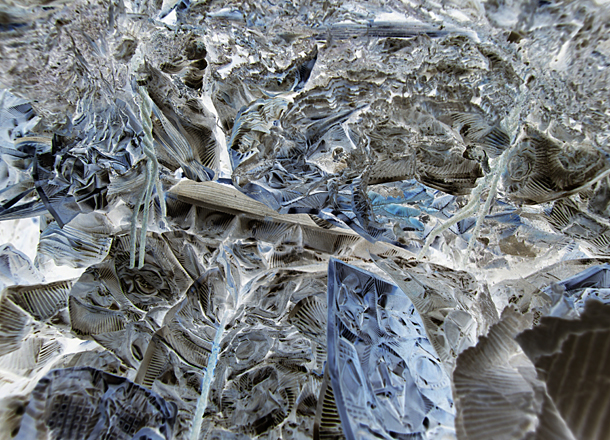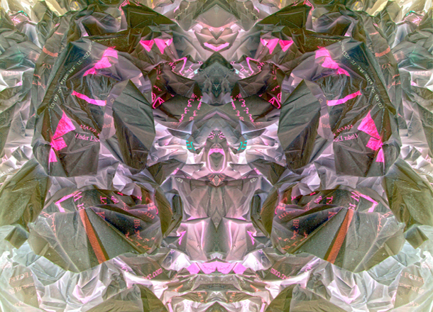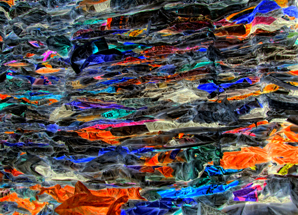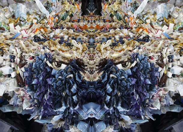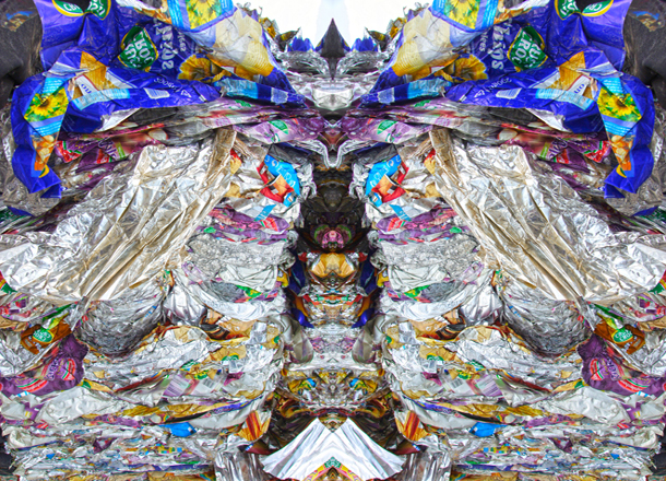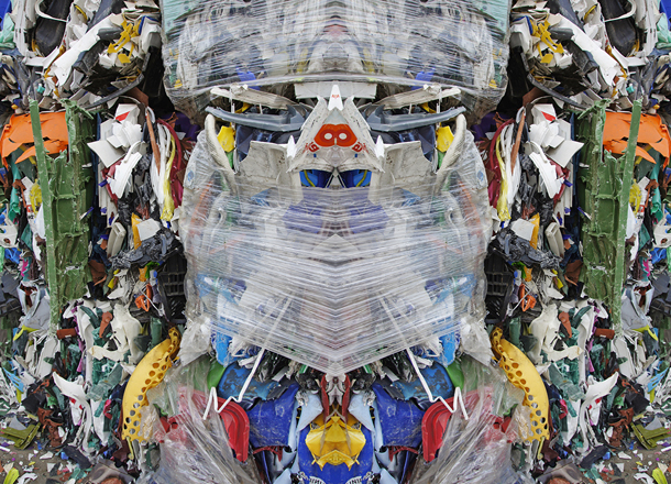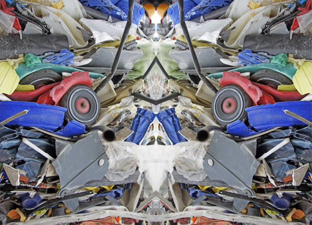Bei einigen Bildern habe ich eine Farbbearbeitung vorgenommen. Alle Motive sind ohne jegliche Montage. Im Resultat entstehen irritierend bizarre Gebilde mit gemäldeartiger Wirkung. Motive, die ich gespiegelt zusammengefügt habe, formen sich ihre Monstrositäten. Die vorgebliche Prächtigkeit erweist sich als eine Ästhetik der Lethargie – diese von mir dokumentierten, zu Weiterverwertungen vorgesehenen Mengen von Abfall, sind im Grunde eine lobenswerte Tat. Es sollten sich aber die weltweiten „Müllberge“ gar nicht erst anhäufen.