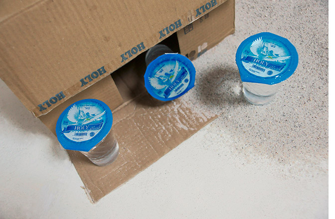 Der Titel für meine Arbeit ist der auf einen Pappkarton gedruckte Produktname HOLY. Diesen fand ich im Frühjahr 2015 während einer Globalisierungsforschung auf Bali in einem kleinen Lebensmitteldepot. Er ist die Verpackung von `Holy Mood´-Trinkwasser, abgefüllt in Einweg-bechern aus Kunststoff.